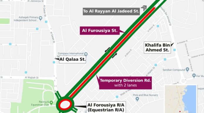 DOHA: The Public Works Authority ‘Ashghal’ has announced that it will close part of Al Furousiya Street, in the two lanes leading from Al Furousiya Roundabout (Equestrian R/A) towards Al Rayyan Al Jadeed Street, starting from tomorrow for a period of five months, in coordination with the General Directorate of Traffic.