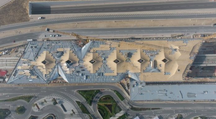 A rare bird’s-eye view (taken from a drone-mounted camera) of the Al Riffa Station layout, illustrating the progress of the roof cladding works. Photo Credit: Qatar Rail