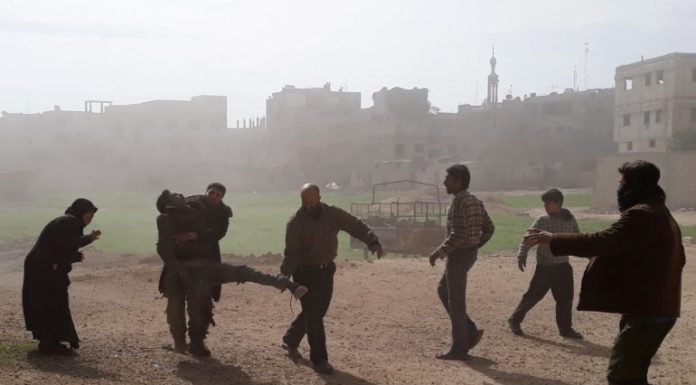 Syrians carry a wounded man who lost in his leg in air strikes on Saqba in Syria's rebel-held Eastern Ghouta area on February 20, 2018. AFP / Msallam ABDALBASET