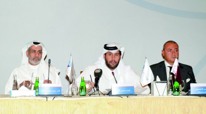 Sheikh Jassim bin Hamad bin Jassim bin Jaber Al Thani (centre) Chairman , QIB; Abdullatif bin Abdulla Al Mahmoud (left), Vice Chairman, QIB; and Bassel Gamal, CEO of the bank, during QIB Ordinary and Extraordinary General Assembly meeting, yesterday. Pic: Abdul Basit/The Peninsula