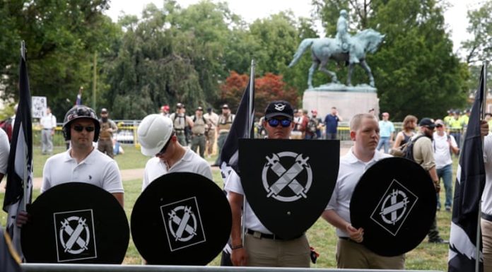 White supremacists, holding shields with a symbol of Vanguard America on them, in Charlottesville