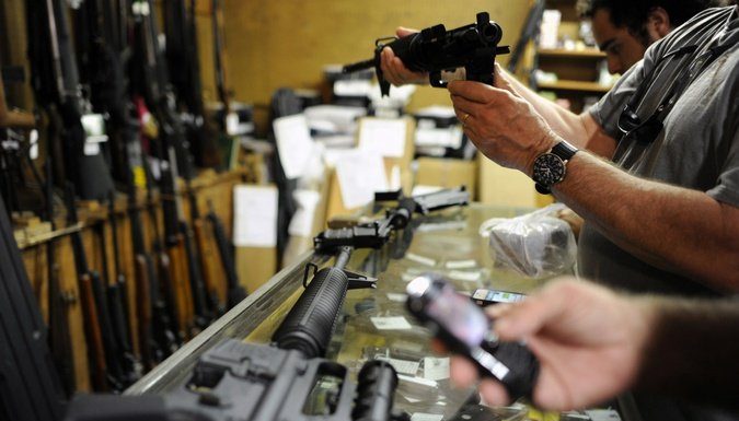 Customers look over the last two AR-15 style rifles for sale inside the Bullet Hole gun shop in Sarasota, Florida (Reuters)