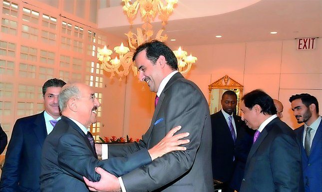 Emir H H Sheikh Tamim bin Hamad Al Thani with the Emir of Kuwait, H H Sheikh Sabah Al Ahmad Al Jaber Al Sabah, at the headquarters of Kuwait’s Permanent Mission to the United Nations in New York, yesterday.