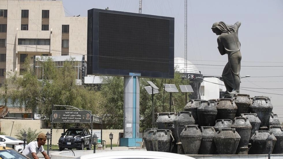 Vehicles drive past a shut advertisement screen at Kahramana square in Baghdad on August 20, 2023. © AFP