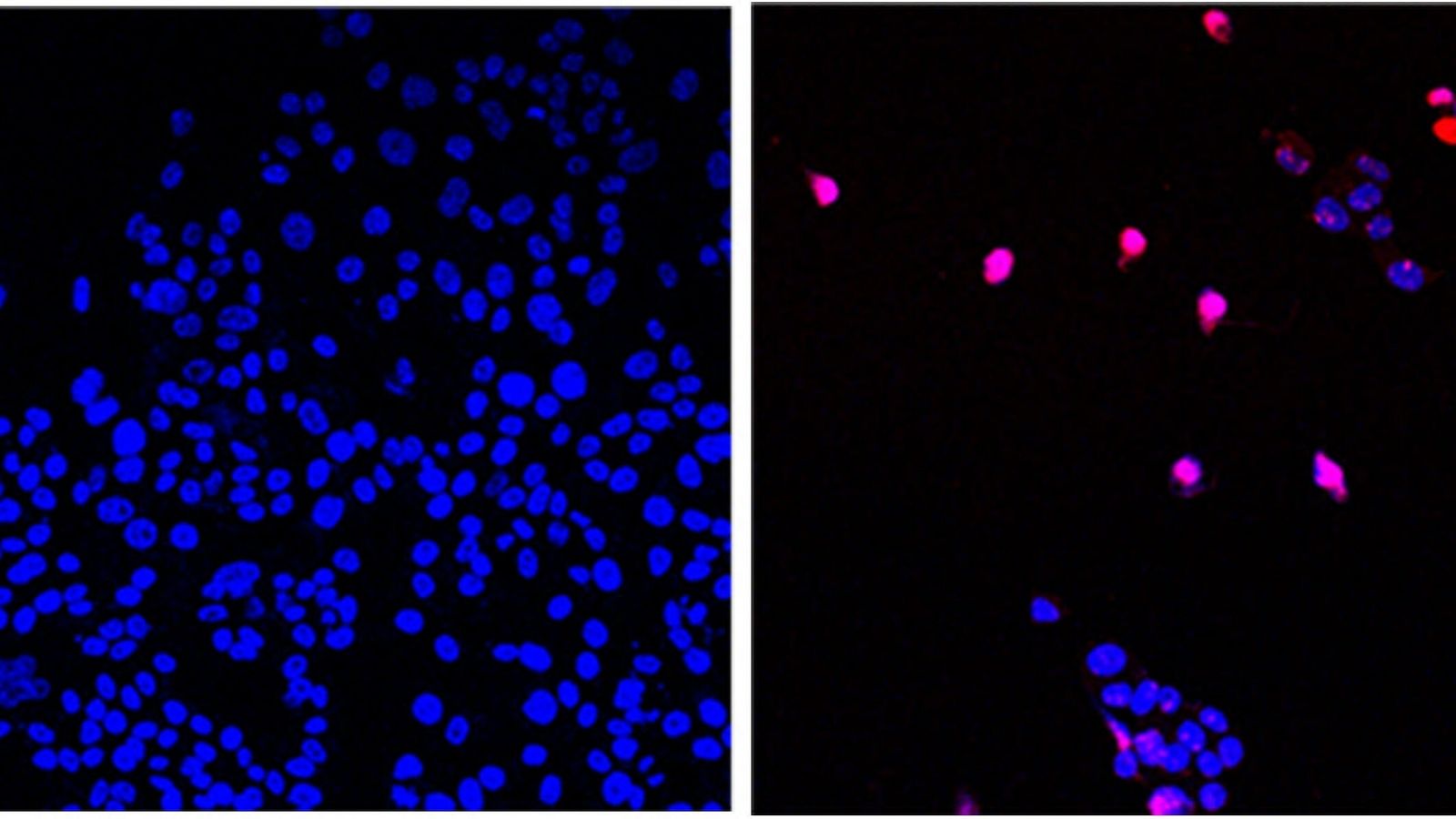 Untreated cancer cells can be seen on the left – and cells treated with the new drug are on the right. Pic: City of Hope