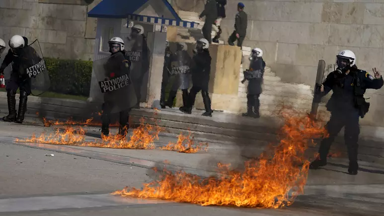 Molotov cocktails were thrown at riot police outside the Greek Parliament during clashes in Athens.