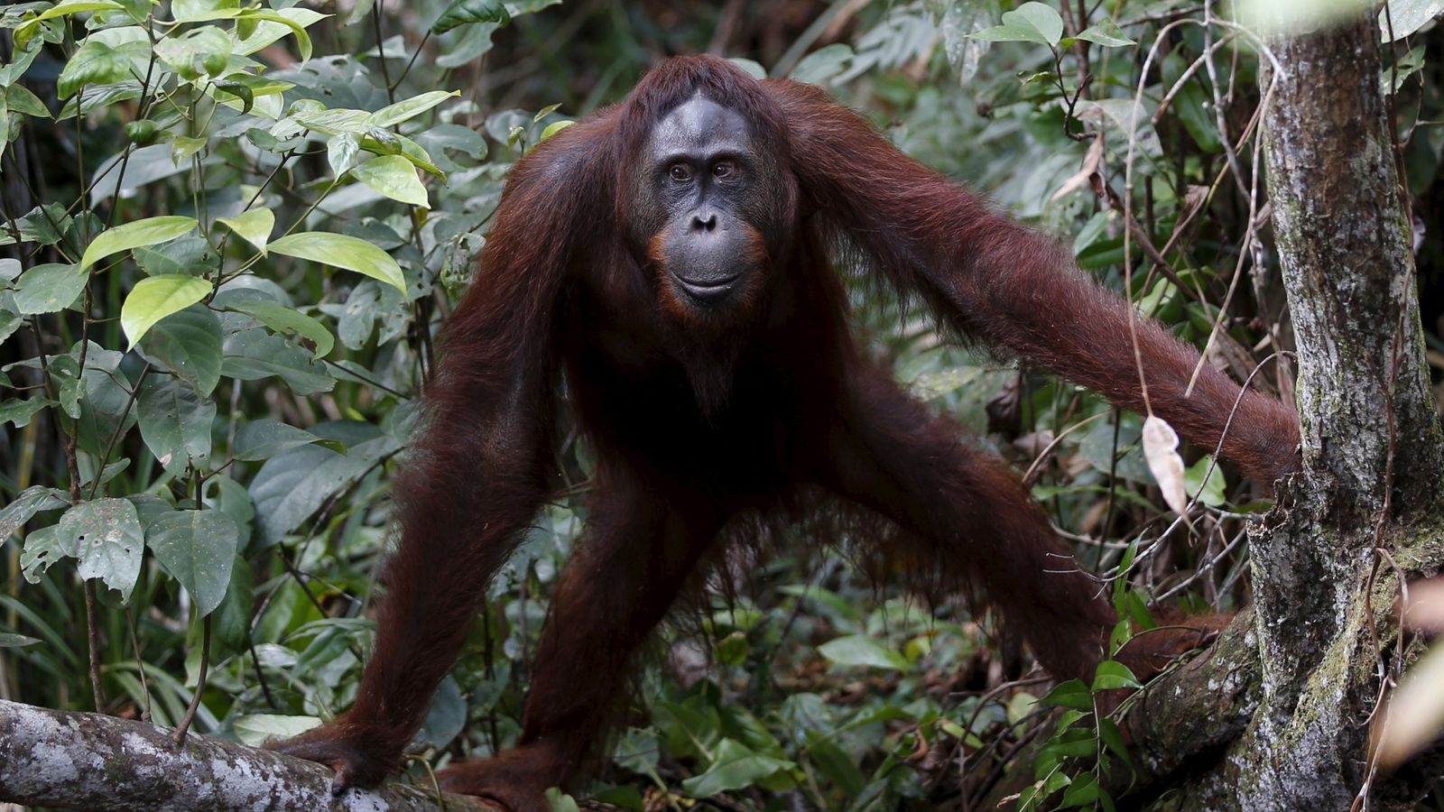 An orangutan watches across a river as tourists boats arrive to visit Camp Leakey in Tanjung Puting National Park in Central Kalimantan province, Indonesia