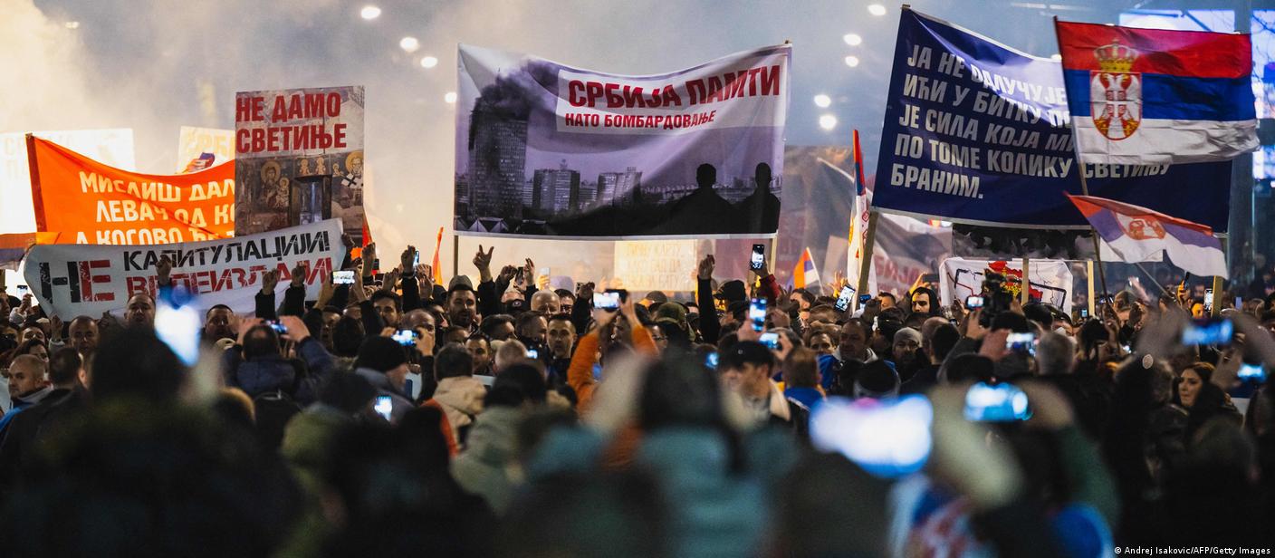 Serbian protesters carried banners with slogans stating: “No to capitulation,” denouncing the EU plan, as they marched towards the presidency in BelgradeImage: Darko Vojinovic/AP Photo/picture alliance