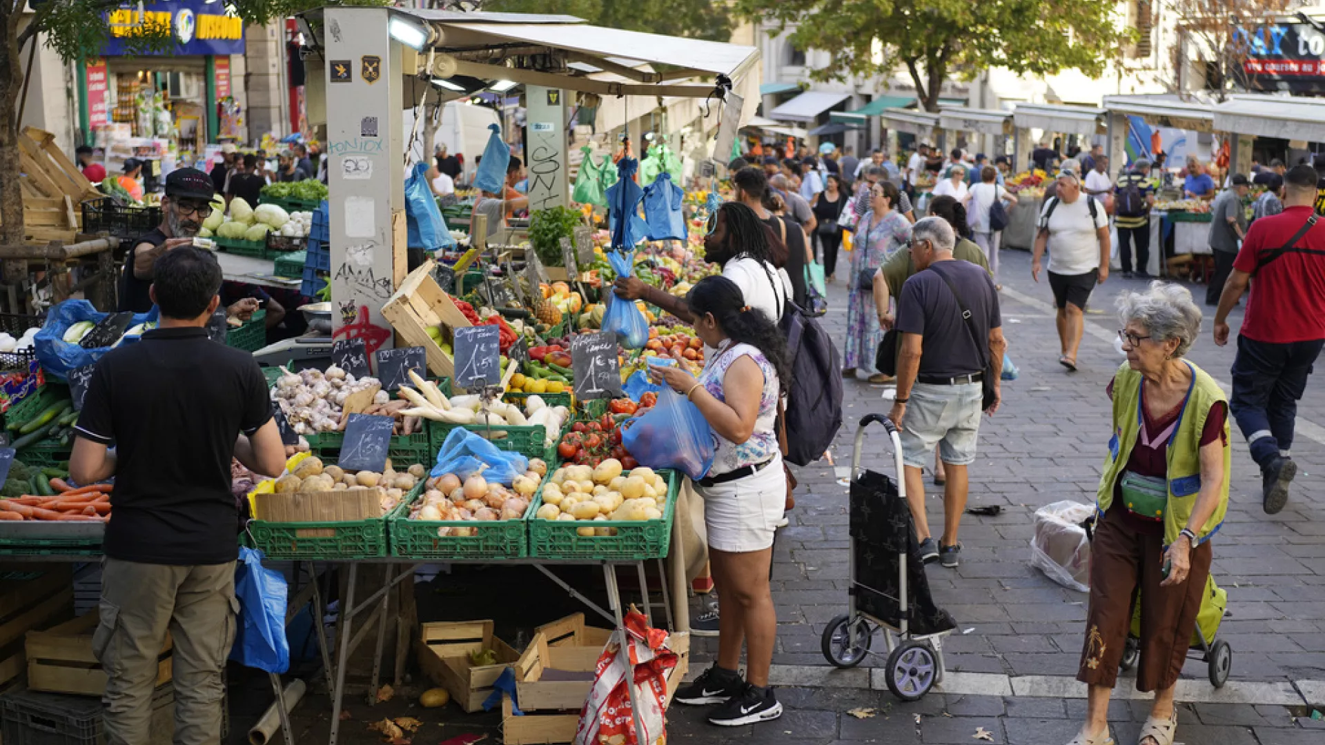 People shop at a street grocery market in Marseille, France, Thursday, Sept. 14, 2023.
