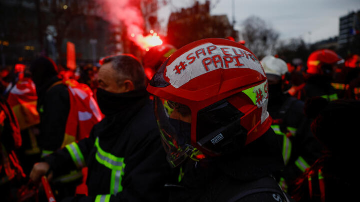 Firefighters take part in a demonstration against the French government’s pension reform plan in Paris, as part of the sixth day of national strike and protests, in France, March 7, 2023. © Sarah Meysonnier, Reuters