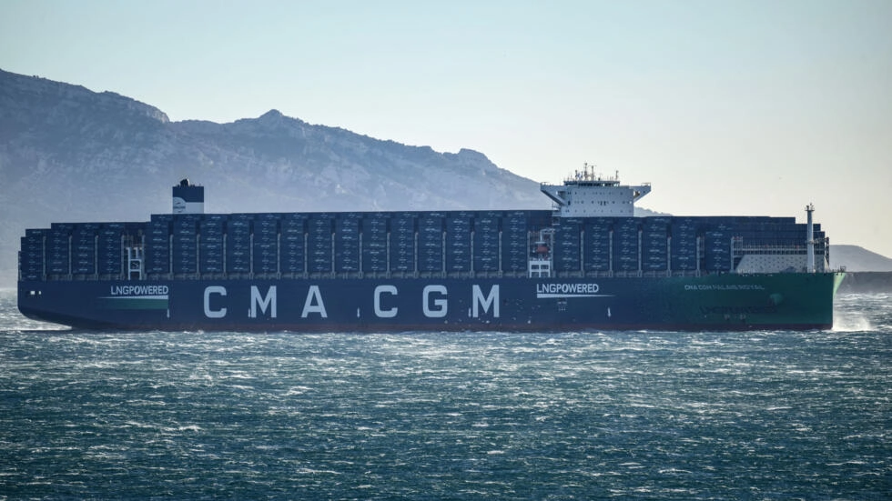 French shipping group CMA CGM’s “Palais Royal”, the world’s largest container ship powered by natural gas, sails in the bay of Marseille, southern France, December 14, 2023. © Christophe Simon, AFP