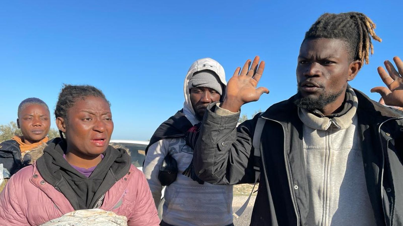 “They are big robbers and big racists. We left by boat and they took our phones, our belongings and our engines,” he shouts.
