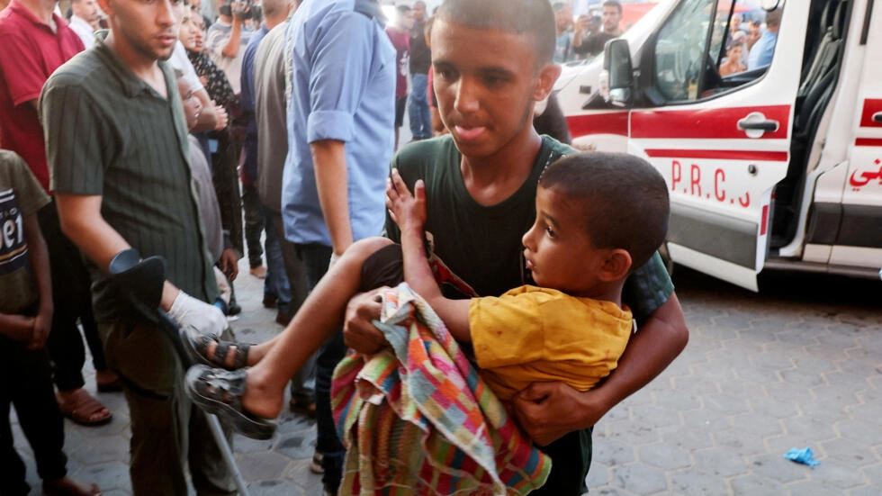 A person carries a Palestinian child, who was wounded in an Israeli strike, amid the Israel-Hamas conflict, in Deir Al-Balah in the central Gaza Strip, June 4, 2024. © Ramadan Abed, Reuters
