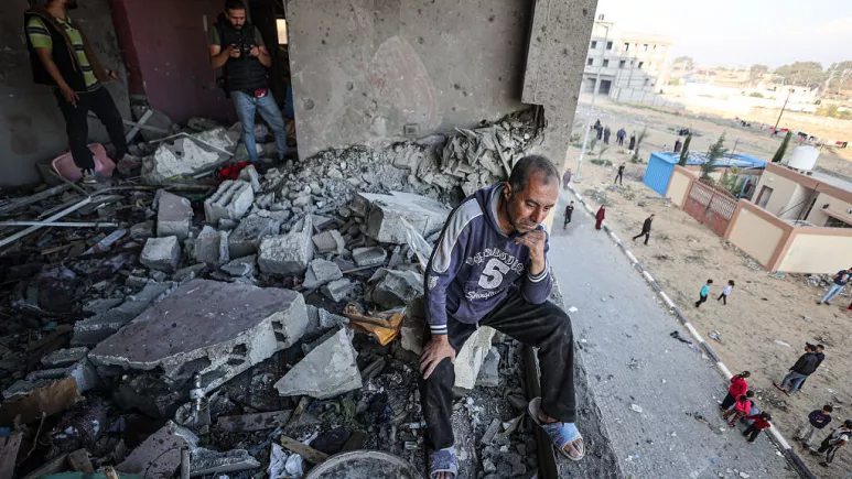 A Palestinian man cries, looks at the destruction after Israeli fighter jets strike residential buildings in Hamad Town, northwest of Khan Yunis, Gaza