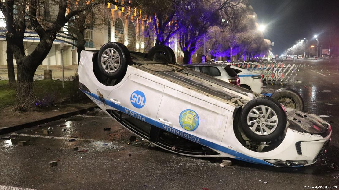 An overturned police car on the streets of Almaty, KazakhstanAn overturned police car on the streets of Almaty, Kazakhstan