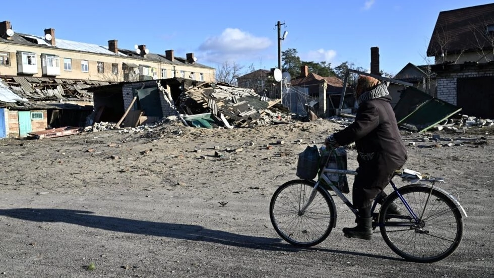 A local resident rides a bicycle next to destroyed buildings in the town of Lyman, in the Donetsk region of Ukraine, on December 14, 2022. © Genya Savilov, AFP