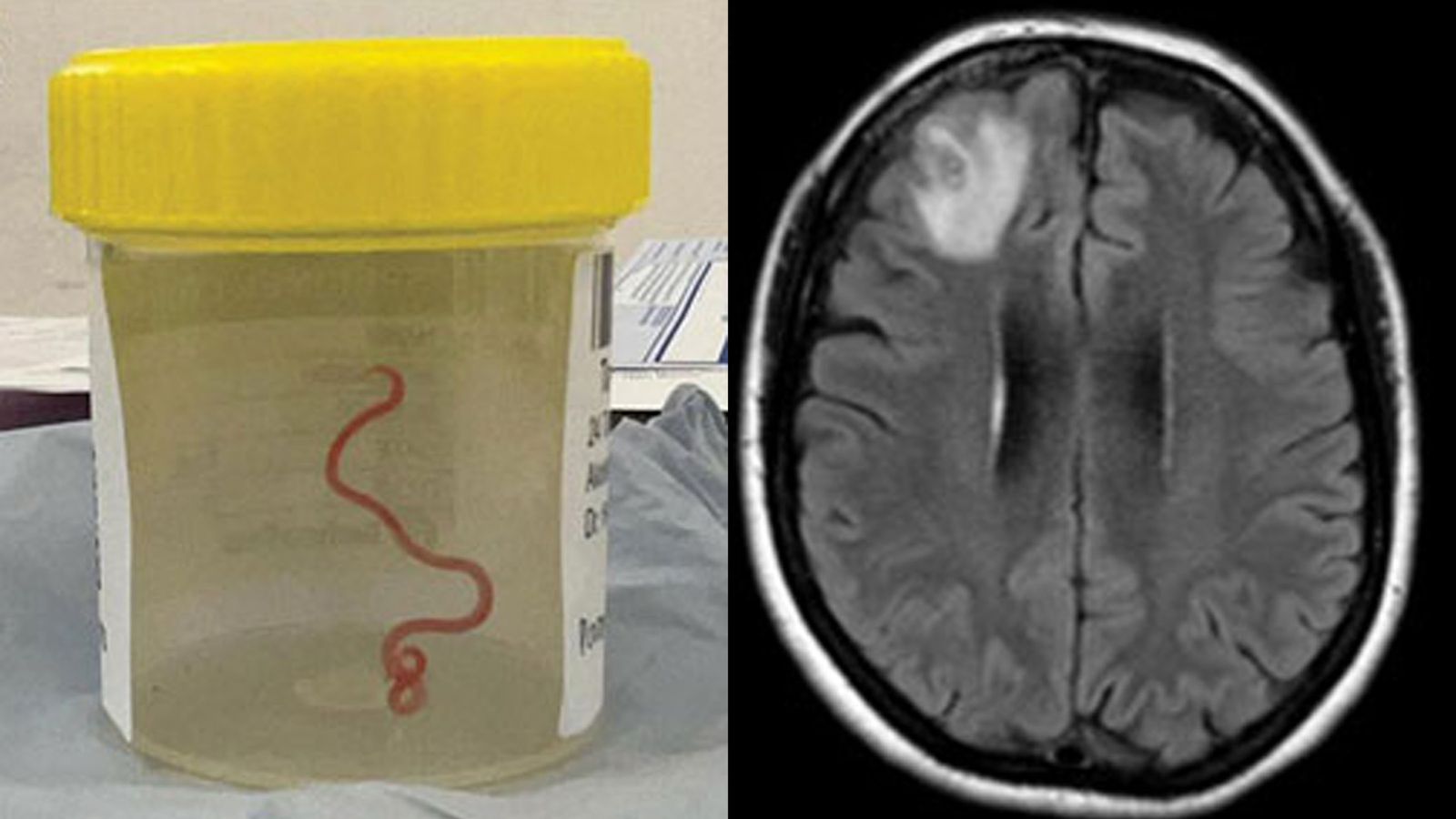 An MRI scan of her brain revealed that a motile helminth – a parasitic roundworm – was living in the right frontal lobe lesion of her brain.
