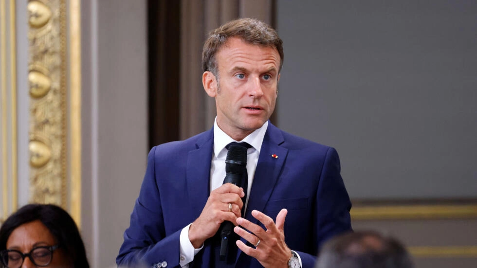 French President Emmanuel Macron addresses mayors of cities affected by the violent clashes that erupted after a teen was shot dead by police last week during a meeting at the presidential Elysee Palace in Paris, July 4, 2023. © Ludovic Marin, AP