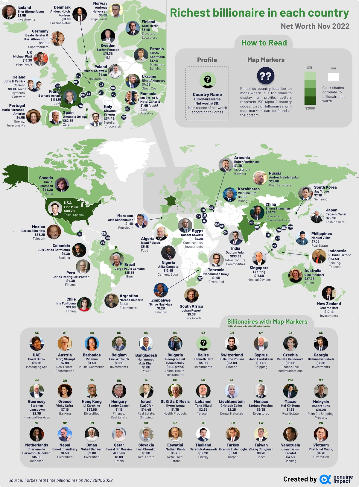 Here’s a breakdown of all the countries that have at least one billionaire. For countries with more than one, we’ve highlighted the billionaire with the highest net worth as of November 28, 2022: