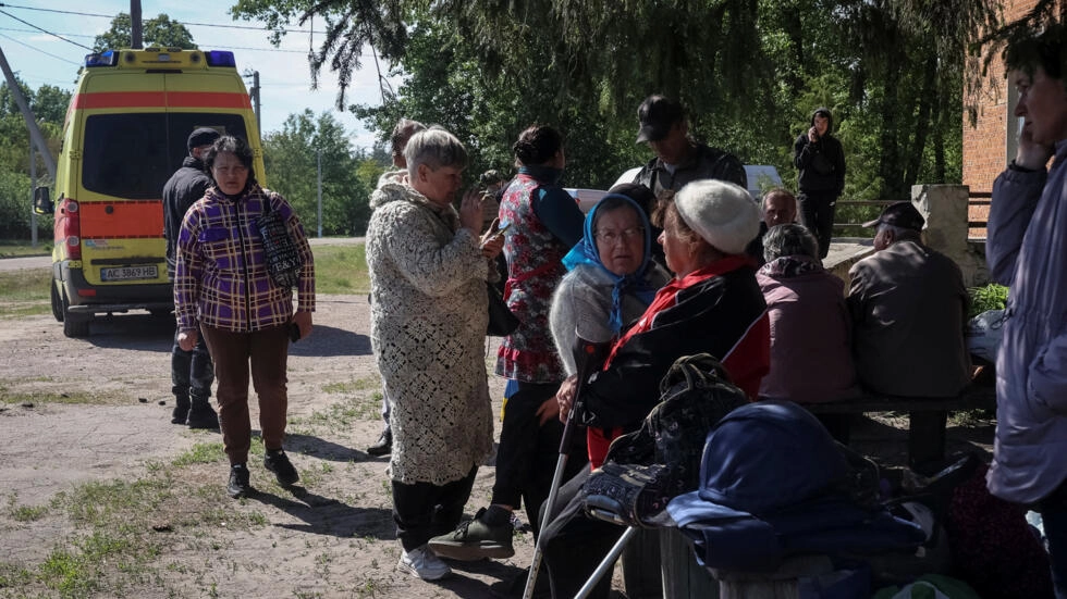 Residents from Vovchansk and nearby villages wait for evacuation to Kharkiv due to Russian shelling near the town of Vovchansk, May 10, 2024. © Vyacheslav Madiyevskyy, Reuters