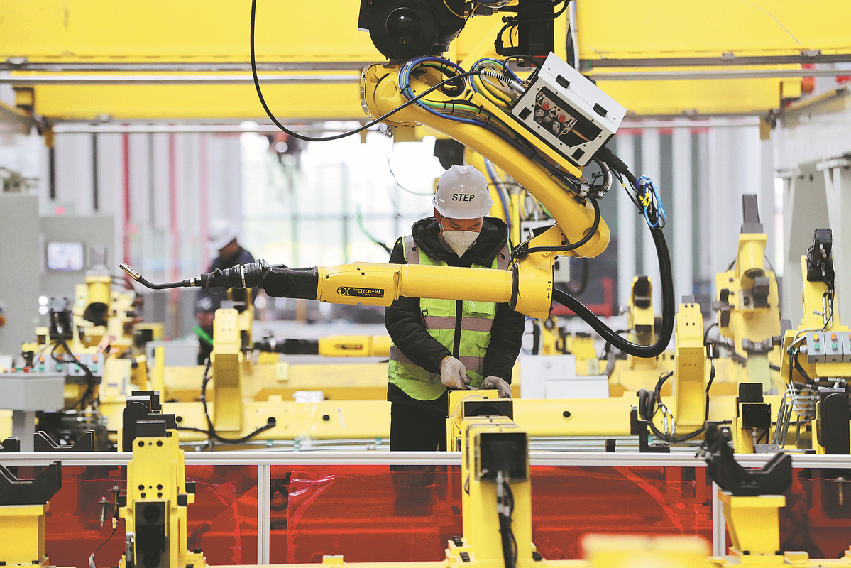 An employee works on an intelligent production line of a machinery equipment manufacturer in Huzhou, Zhejiang province. [Photo by Xie Shangguo/For China Daily]