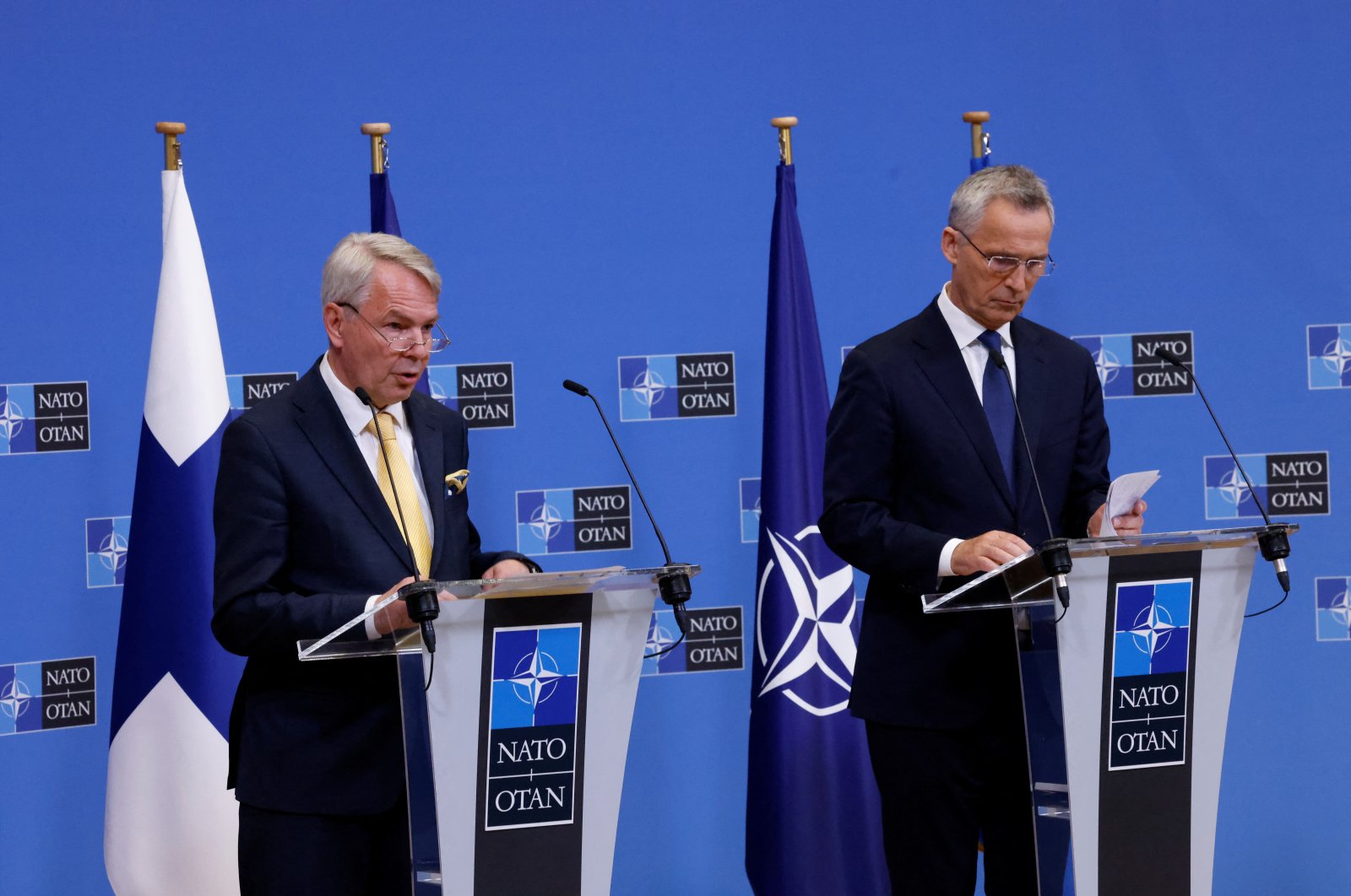Finland's Foreign Minister Pekka Haavisto (L) and Sweden's Foreign Minister Ann Linde (not pictured) attend a news conference with NATO Secretary General Jens Stoltenberg (R), after signing their countries' accession protocols at the alliance's headquarters in Brussels, Belgium July 5, 2022. (Reuters Photo)