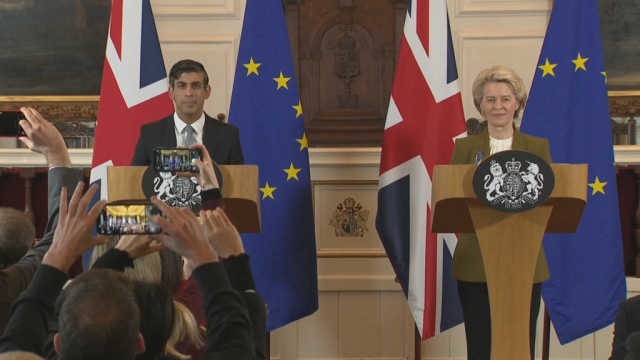 Britain’s Prime Minister Rishi Sunak and EU Commission President Ursula von der Leyen, right, hold a press conference at Windsor Guildhall, England, Monday Feb. 27, 2023. – Copyright AP Photo
