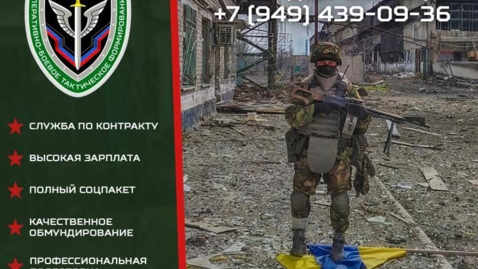 An advertisement for the Russian Cascade military unit, whose fighters are known to be kept at a safe distance from the front line in Ukraine.