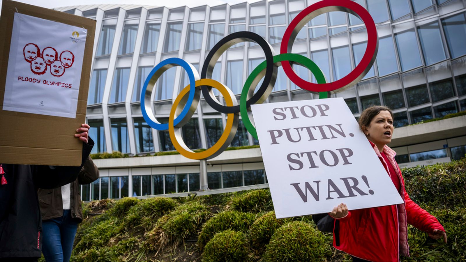 Protesters in Geneva, Switzerland, rallying against Russian and Belarusian athletes participating in the next Olympics