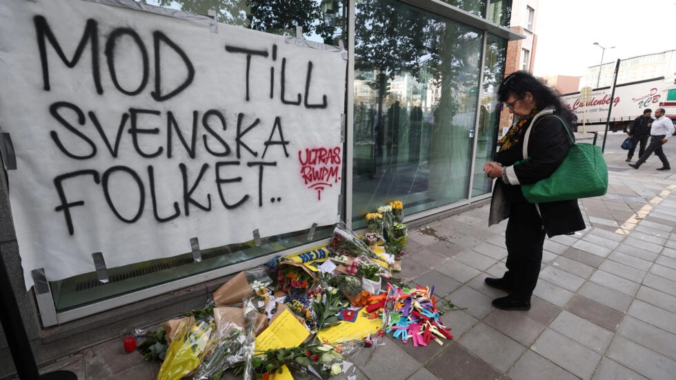 A woman on October 18, 2023 pays tribute to the victims of a shooting attack before a football match in Brussels. © Yves Harman, Reuters