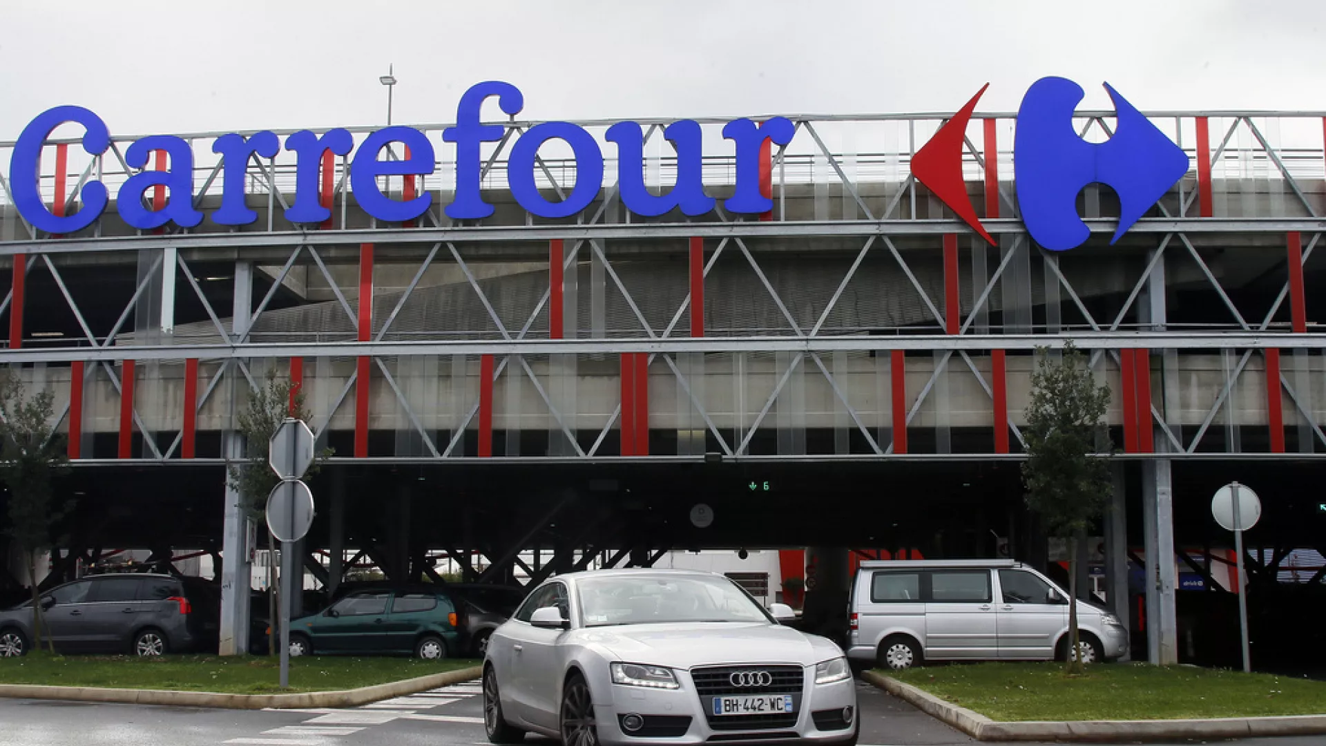 A car leaves a Carrefour supermarket in Anglet, southwestern France