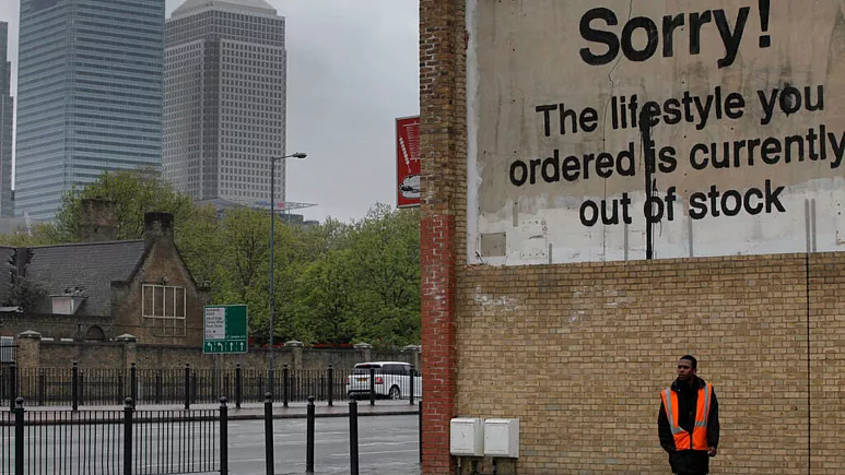 A man walks in east London, backdropped by high rise buildings at the Canary Wharf financial district.