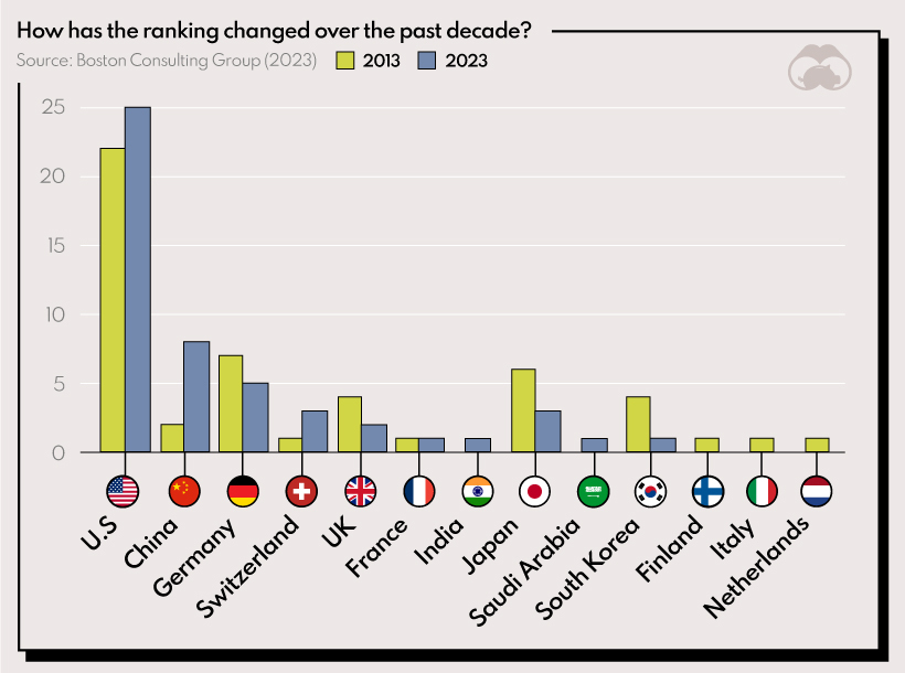 The U.S. and China are the only two countries that have increased their share from 2013, pushing out firms from European countries like Germany, the UK, and Italy. We can also see significant declines in Japanese and South Korean representation.