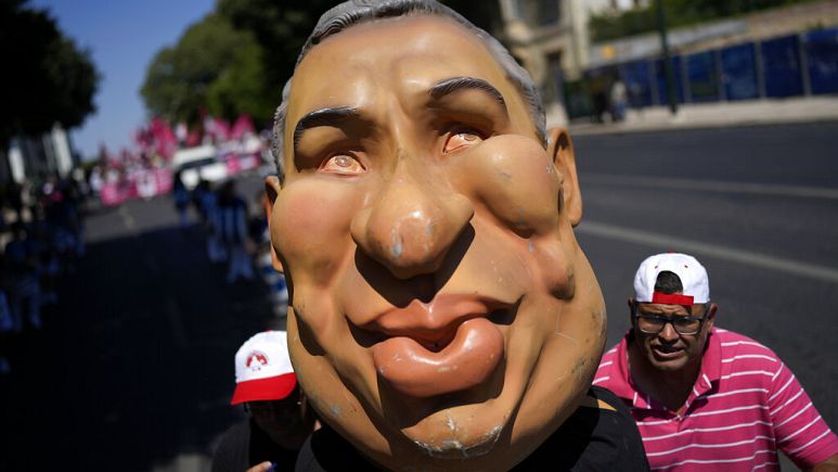 Protestors push an effigy of Portuguese Prime Minister Antonio Costa towards the parliament during a demonstration by workers’ unions in Lisbon, July 2022. – Copyright Armando Franca/Copyright 2022 The AP. All rights reserved