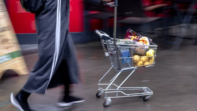 A woman pushes a small shopping cart outside a discount market in Frankfurt, Germany, Thursday, July 27, 2023.
