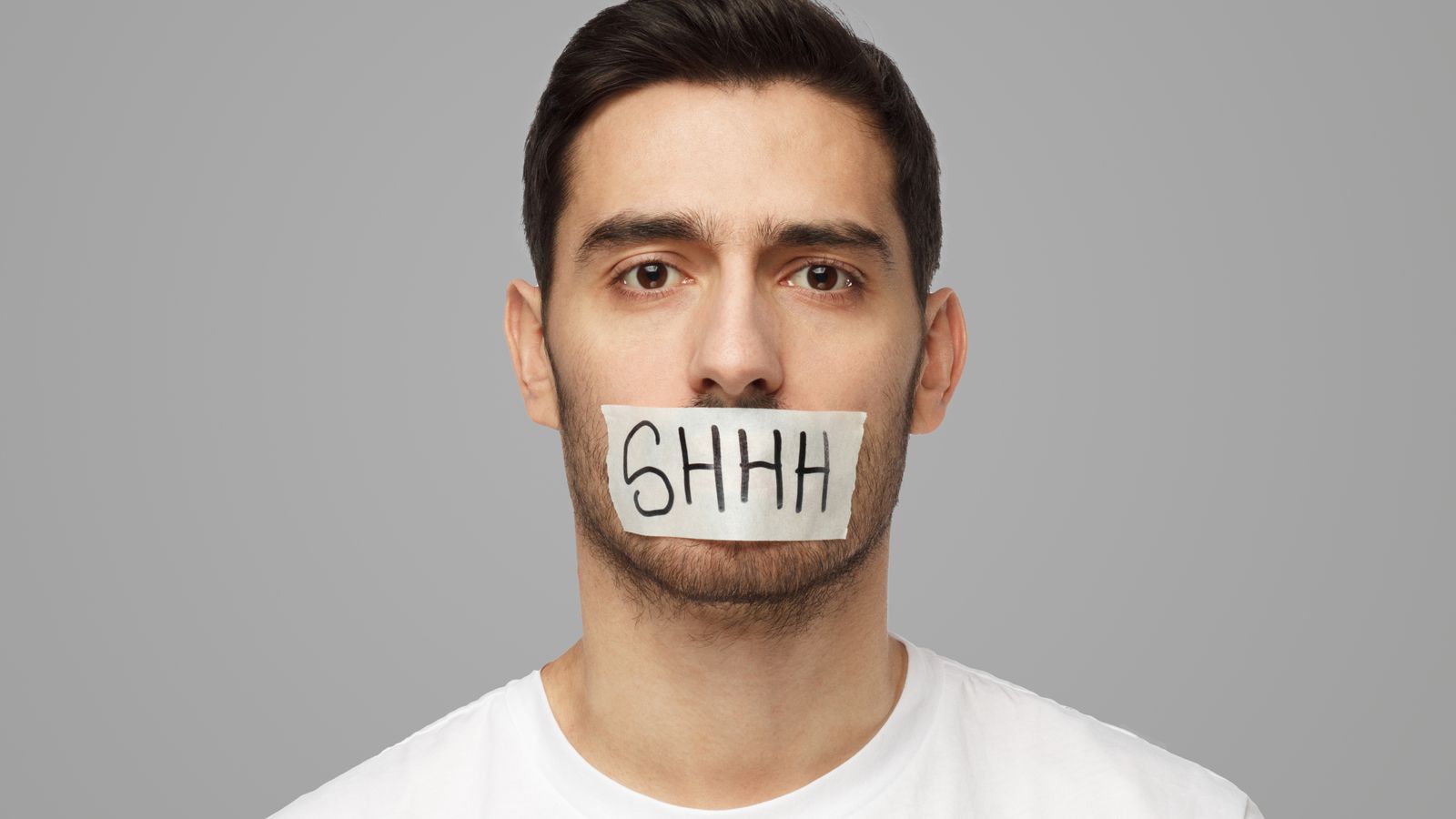 Close up shot of young man with taped mouth with shhh text on it. Pic: Istock by Getty