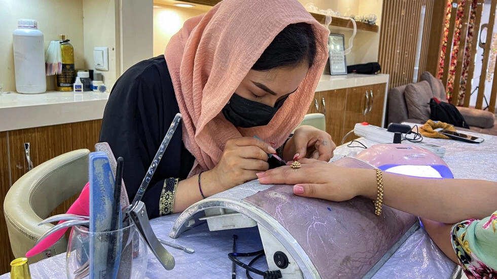 A beautician paints a customer’s nails at a beauty salon in Kabul on July 23, 2023.