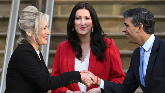 First Minister of Northern Ireland, Michelle O’Neill, and Deputy First Minister of Northern Ireland, Emma Little-Pengelly, greet Prime Minister Rishi Sunak as he arrives at Stormont Castle on February 5, 2024 in Belfast, Northern Ireland © Getty Images / Charles McQuillan/Getty Images