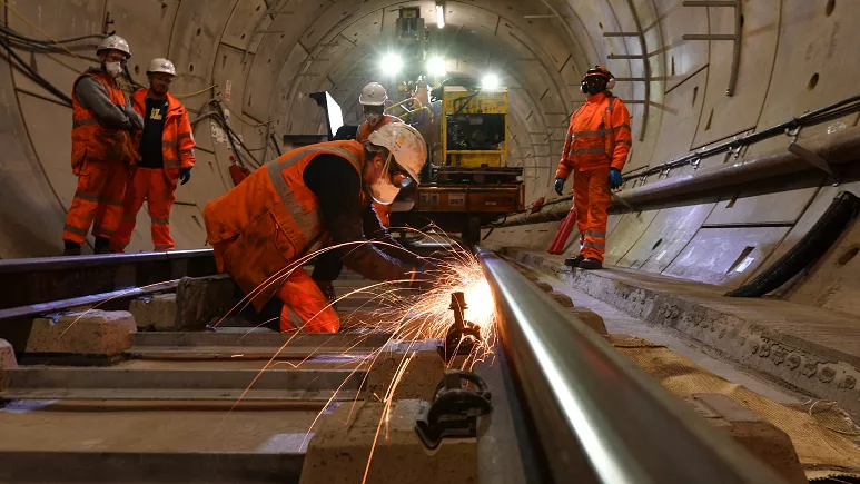 Construction workers work on a section of train track inside a Crossrail tunnel, beneath Stepney in east London on November 16, 2016.