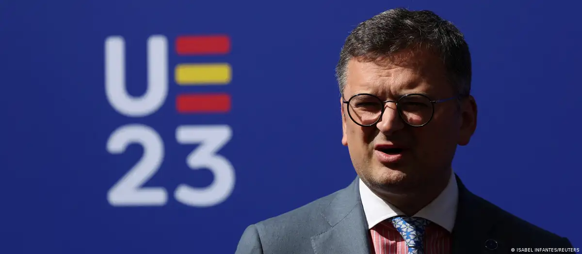 Ukraine’s Foreign Minister Dmytro Kuleba speaks to the media during an informal meeting of EU foreign ministers in Toledo, Spain, August 31, 2023.
