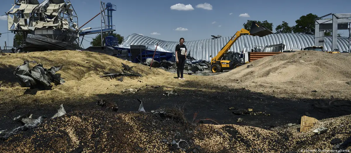 A woman stands among debris of a farm storage building destroyed during a Russian attack in Odesa region, Ukraine, on July 21, 2023.
