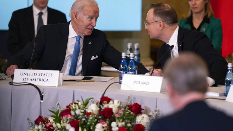 President Joe Biden talks with Polish President Andrzej Duda during a meeting with the leaders of the Bucharest Nine, Wednesday, Feb. 22, 2023, in Warsaw. – Copyright AP Photo