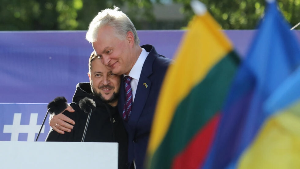 Ukrainian President Volodymyr Zelensky (left) and Lithuania’s President Gitanas Nauseda embrace after addressing the crowd at Lukiskiu Square in Vilnius on July 11, 2023, during a NATO Summit. © Petras Malukas, AFP