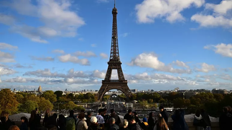 Tourists near the Eiffel Tower, Paris, November 2023.