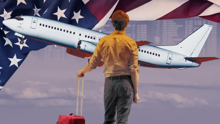 A photo illustration shows a man holding a wheeled carry-on, a passenger jet taking off and the U.S. flag.