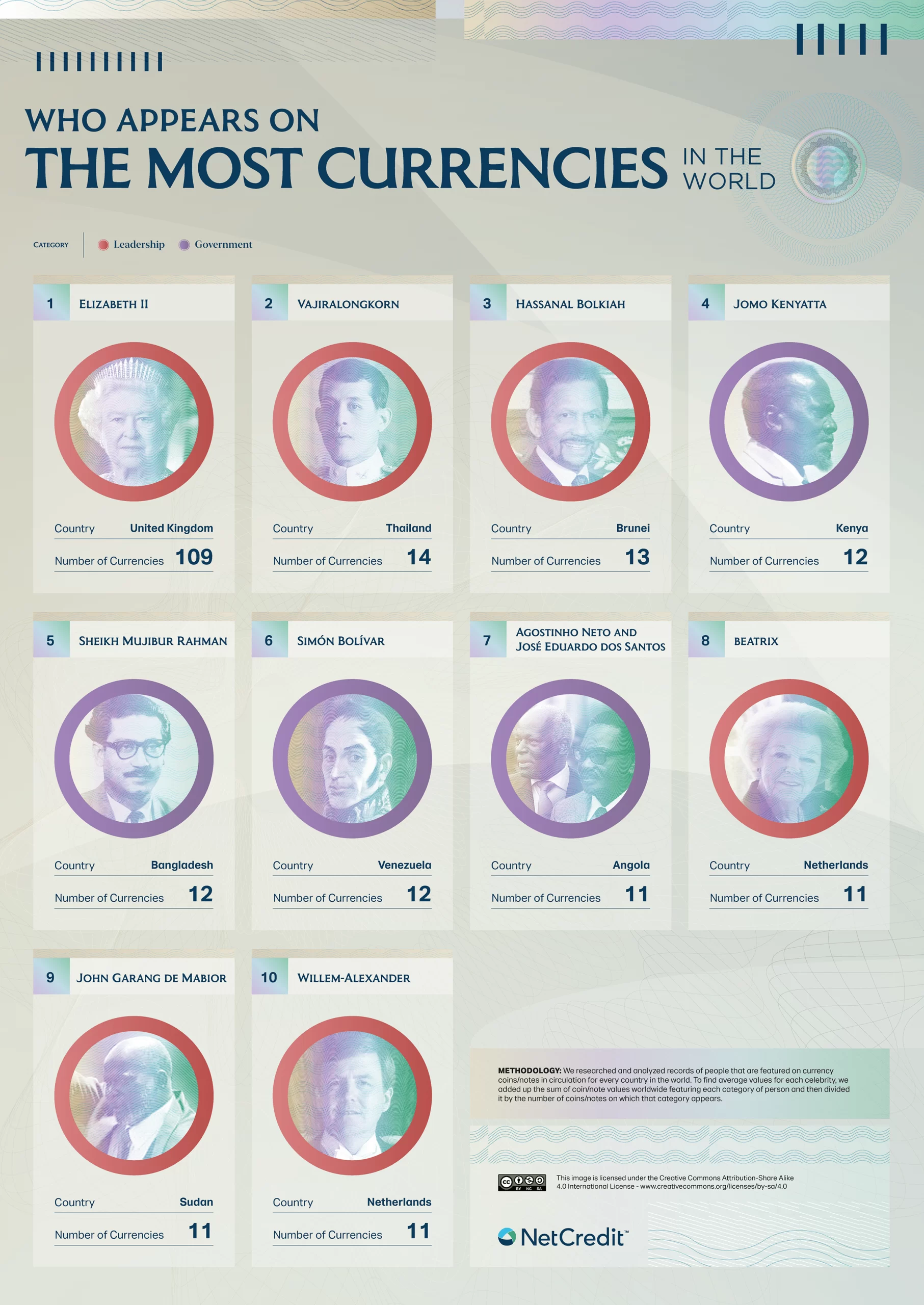 Perhaps unsurprisingly, 6 of the top 10 most-featured people on currencies are monarchs, while the rest are heads of government.