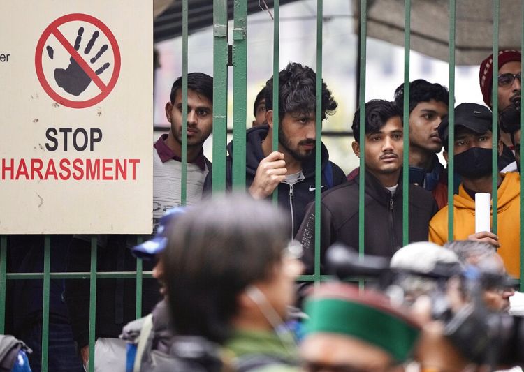 Students watch security personnel guard the main gate of Jamia Millia Islamia university, where an unauthorised screening was planned.Manish Swarup/Copyright 2023 The AP. All rights reserved.