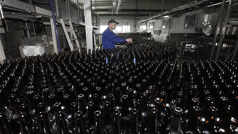 An employee works at a line bottling beer at Carlsberg brewery “Baltika-Pikra” factory in Krasnoyarsk, January 10, 2013.