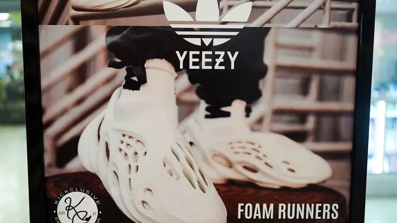 A sign advertises Yeezy shoes made by Adidas at Kickclusive, a sneaker resale store.